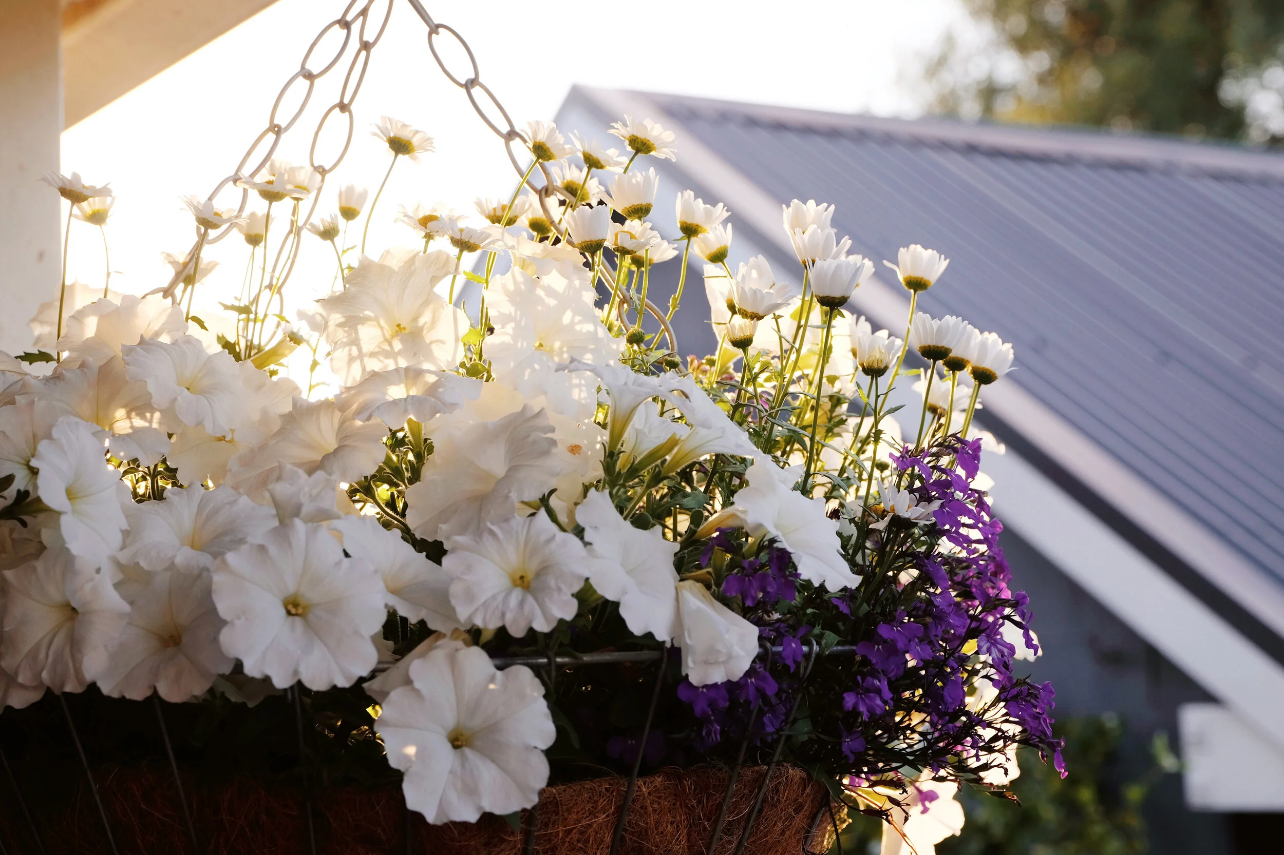 White petunias with mini chrysanthemums and lobelia in a hanging basket