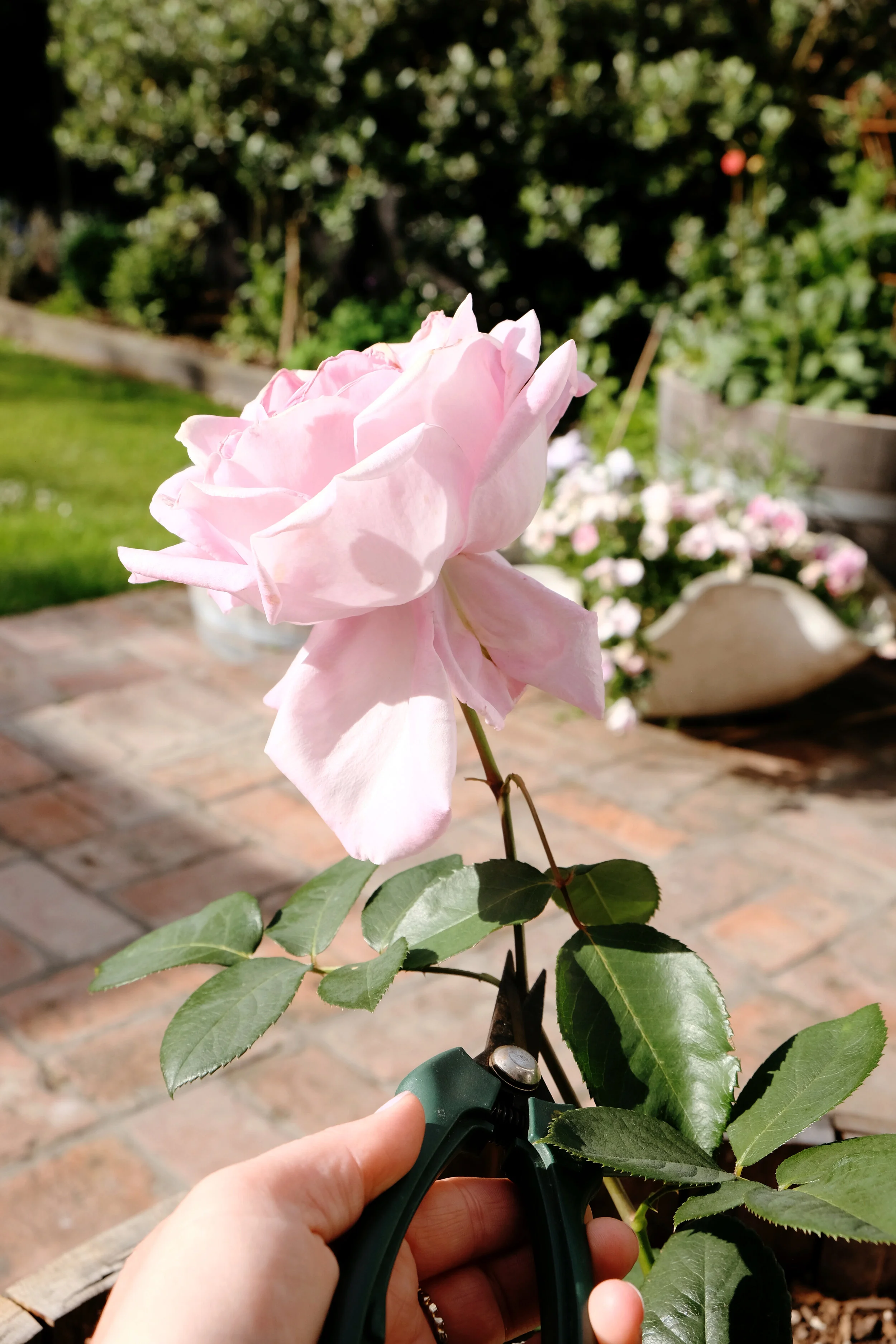 For hybrid tea roses that usually have one bloom per stem, you want to only come down to snip off just above the first five-leaflet leaf to encourage another go. It is incredibly satisfying to see the fresh new growth firing away for round two.