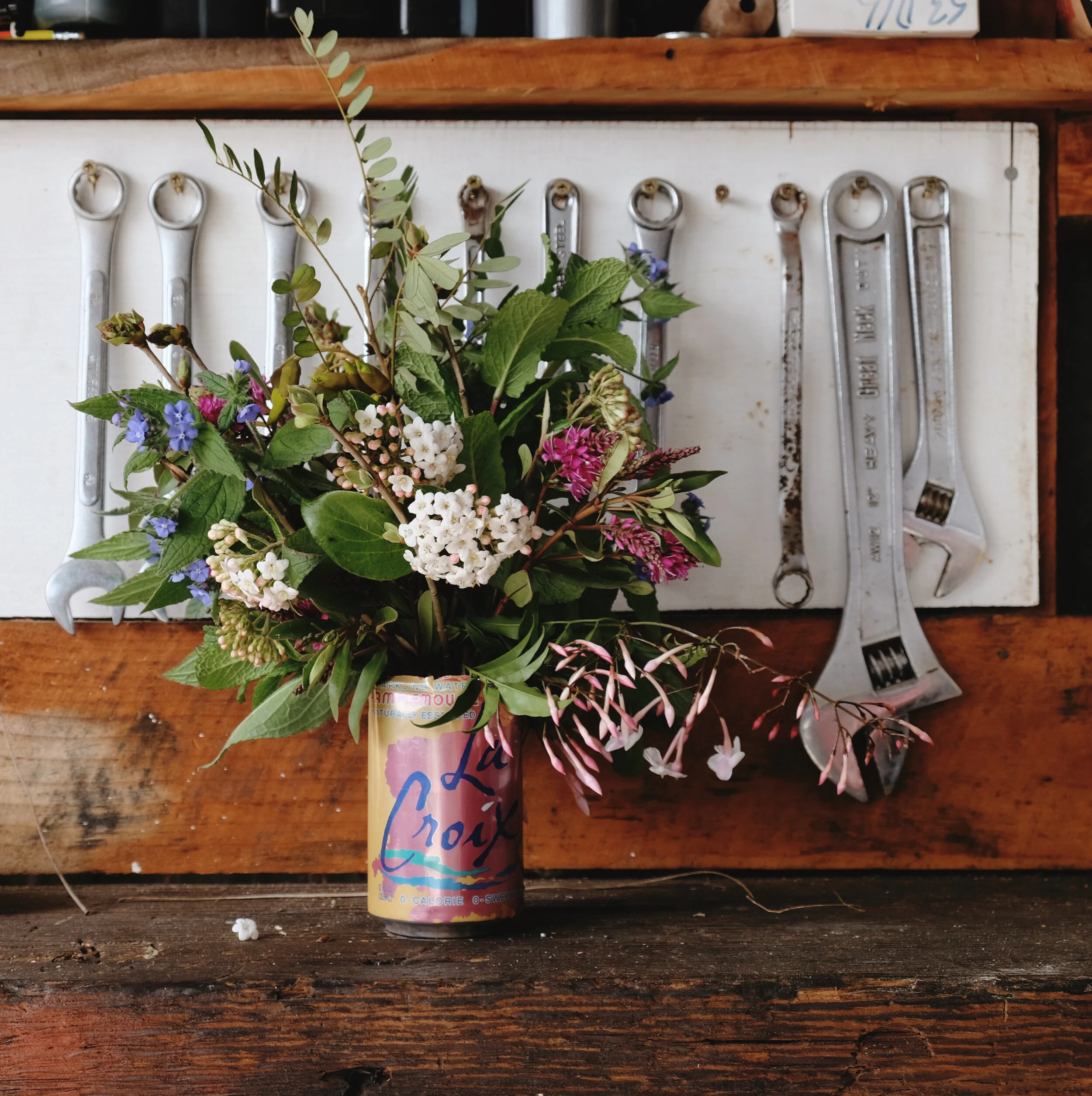 I created this fun bouquet while out walking the block in our friend’s quaint bay on Banks Peninsula, Canterbury. The need for the can arose when I realised there were no vases but also, I wanted to transport my bunch home in the car with a little water to keep it happy. So recycling ensued!