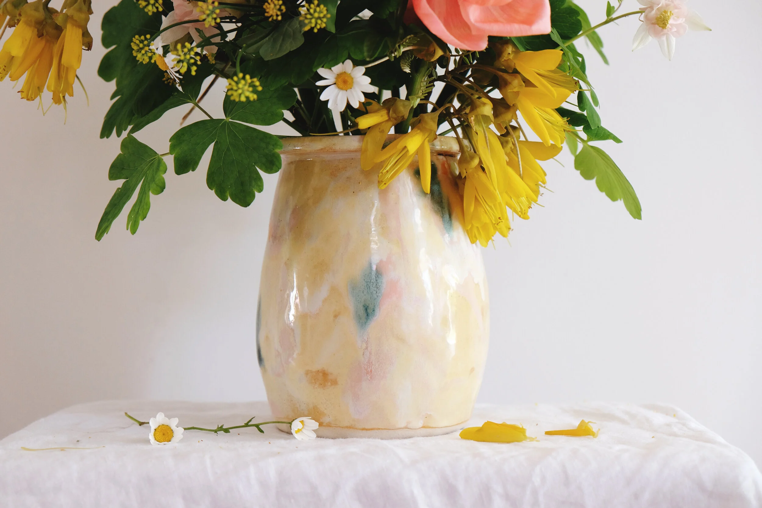 I also relished the chance to nibble some short branches of that incredibly plump flowering kowhai with this interesting mix of shapes in a vase made by Felicity Donaldson Smith of Wundaire, one