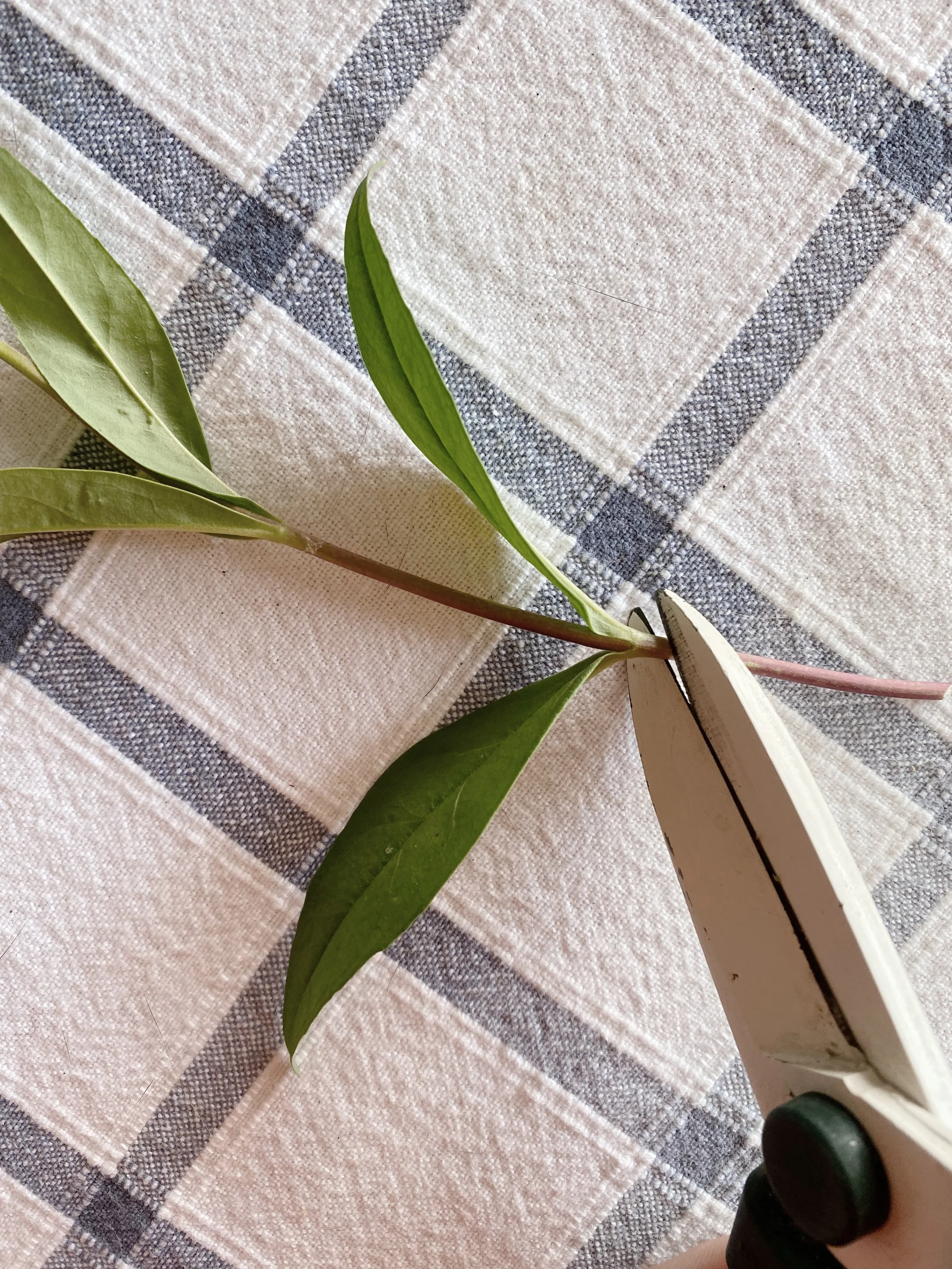 With a sharp clean pair of secateurs or knife at hand, measure 7- 10 cm down from the tip, making your cut just below a leaf joint (commonly referred to as a node). This is where your new roots will bud from.